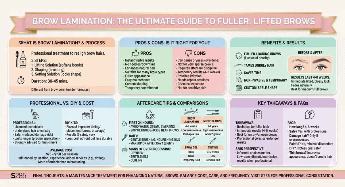 At S285, we encourage clients to view brow lamination as a maintenance treatment rather than a miracle fix. Used responsibly, it enhances natural brows while preserving hair health. Overuse or poor application can undo the benefits. When you balance cost, care, and frequency, brow lamination can be well worth it for the right candidate. Understanding both the glow and the limits of this treatment is the key to loving your results long after you leave the salon.